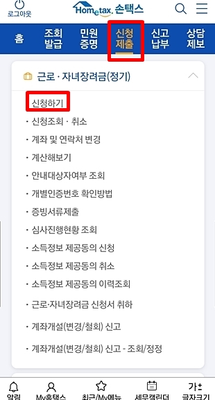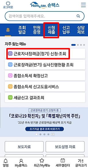 저처럼 메인 자주찾는 메뉴에 근로장려금 정기 신청하기가 떠있을 수 있지만 없는 분들은 맨 위 탭에 '신청 제출'로 들어가시면 됩니다.