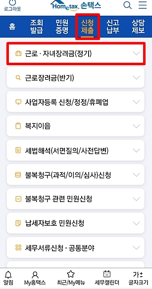 '근로, 자녀장려금(정기)' 클릭해주세요.