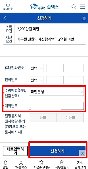 연락처를 적는것은 선택이고요. 수령방법은 현금, 은행 중 선택하시고, 은행을 선택하셨다면 원하는 은행명 선택 후 계좌번호를 적어주시면 됩니다. 다 작성하셨다면 '신청하기'를 눌러보세요.