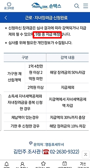 근데 처음 국세청 카톡에서는 8월 말에 지급이라고 하더니 여기서는 9월 중 지급이라고 뜨네요. 정확한 일정은 안 잡혔고 아마 처리되는 시간에 따라 8월 말~9월 사이에 지급될 예정인 것 같습니다.